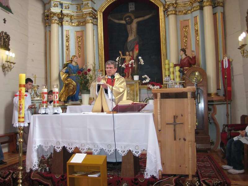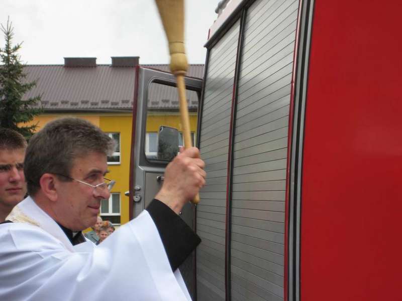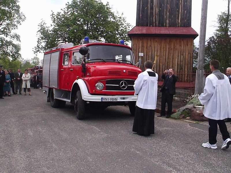 Po Mszy Świętej ksiądz proboszcz dokonał poświęcenia nowo zakupionego samochodu bojowego marki MERCEDES dla jednostki Ochotniczej Straży Pożarnej w Łazorach.