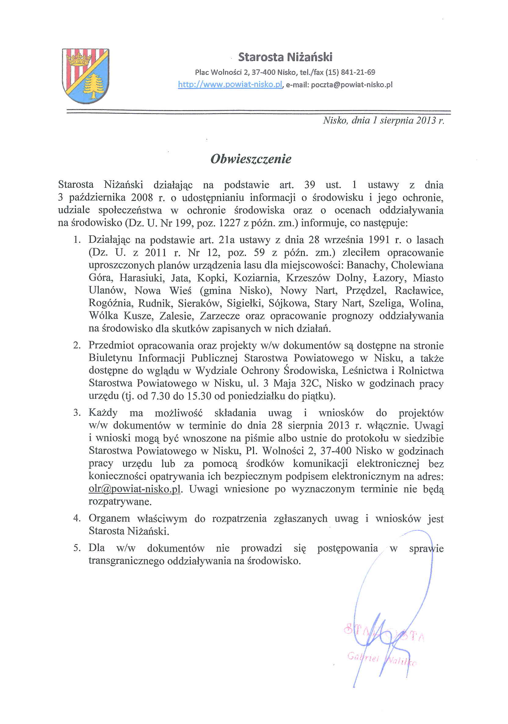 Paweł Pelak) - Dodanie załącznika [obwieszczenie_starostwo.jpg] do dokumentu. (Dokument opublikowany)