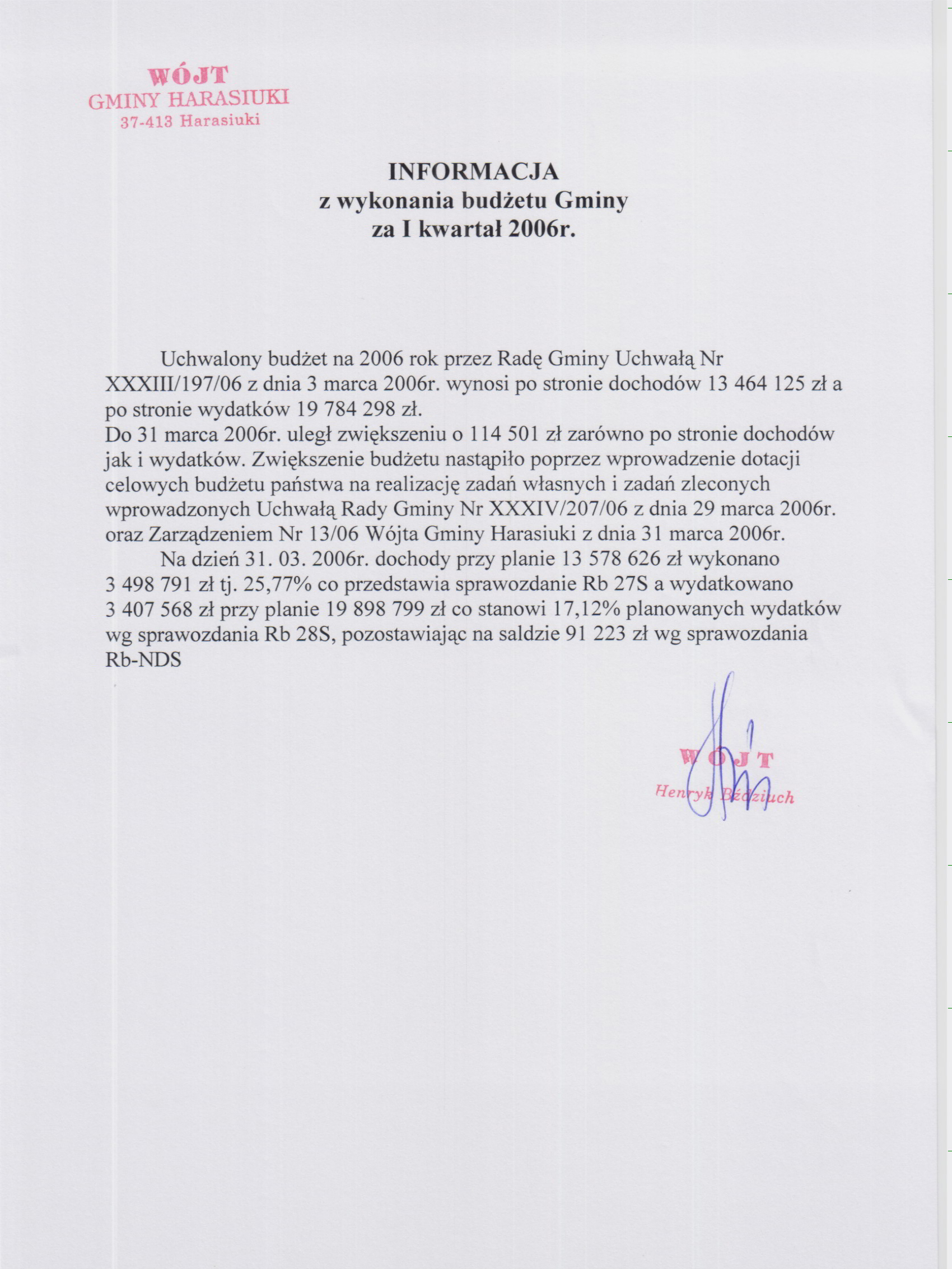 • Informacja z wykonania budżetu Gminy za I kwartał 2006