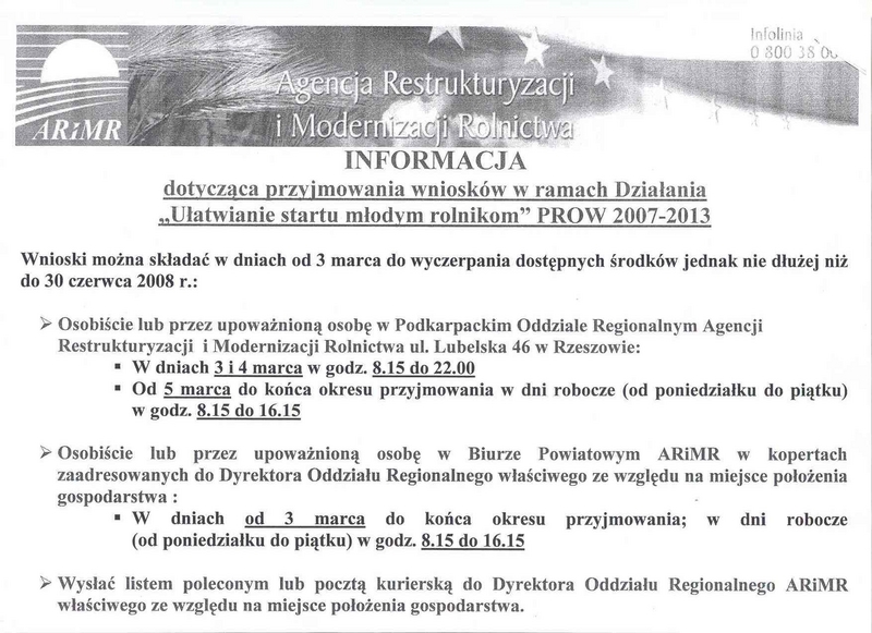 Informacja dotycząca przyjmowania wniosków w ramach Działania Ułatwianie startu młodym rolnikom PROW 2007 2013